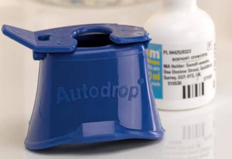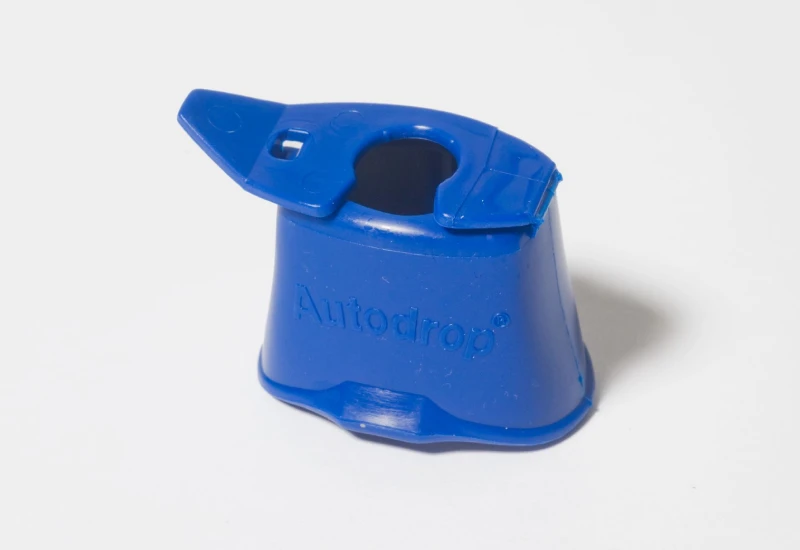 The Autodrop Eye Drop Guide effectively reduces the occurence of missing your eye or accidently blinking while using eyedrops. The Autodrop clips onto the top of your eyedrop container, and fits comfortably over the eye. The Autodrop Eye Drop Guide has a special lip that hold the lower eyelid in place to prevent blinking, a unique pinhole that directs eyesight up and away from the fluid, and a specific shape to insure accuracy. The Autodrop Eye Drop Guide was developed in England, in collaboration with the Royal National Institute for the Blind.The Autodrop Eye Drop Guide can be used in conjunction with the Autosqueeze Eye Drop Bottle Squeezer #AMI 209. The bottle shown in the image is for demonstration only and is not included.