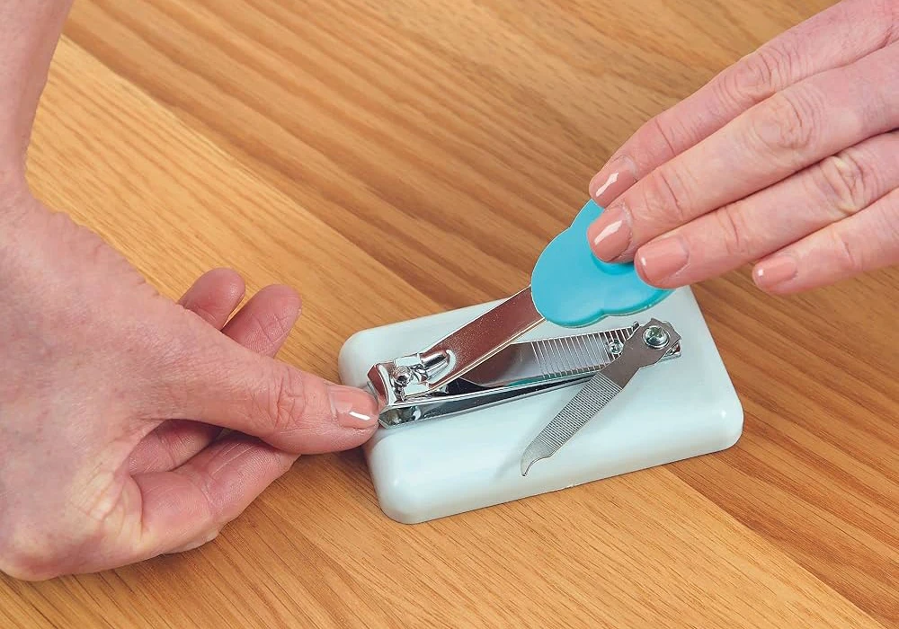The Table Top Finger Nail Clippers are easy to use, stainless steel clippers mounted on plastic base with non-slip feet. The new design has a large finger pad with tactile soft feel pad that provides additional leverage.This mounted adapted nail clipper has been designed for people with limited hand function to increase their personal hygiene independence. The nail clippers are mounted on a plastic base with non-slip feet for increased stability. The molded finger pad with “soft feel” finish provides greater comfort and excellent leverage. The stainless steel clippers have curved edges and a nail file is included.