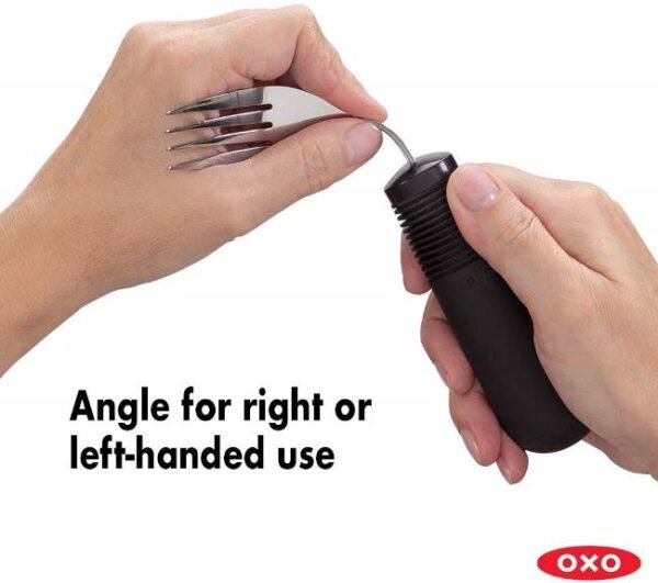 Each of the Big Grip Bendable Weighted Utensils pieces features the Big Grip Bendable handle. This large, non-slip handle is easy to hold and cushions the user’s grip. The twist built into the metal shaft of the spoons and fork allows it to be bent to the left or right. This allows the user to customize the angle to their specific needs and helps make the movement to the mouth easier.