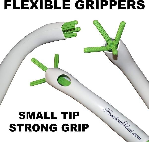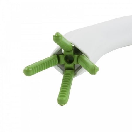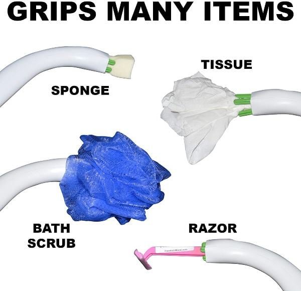 The Freedom Wand Personal Toilet Tissue Aid Compact includes two pieces: the handle, and the head. The Freedom Wand Personal Toilet Tissue Aid Head measures 9 inches long and has a slight curve which allows users to reach easily. The head has four “fingers” that extend out of the wand with the slide of a button. As they extend, they open to hold a shaver, sponge, ointment pad, tissue, bath sponge or other items. When sliding the button back, the fingers go back into the wand, securing the item in place with a tight grip. To release an item, just slide the button forward. It is that easy! The rinse hole in the head helps aid with cleaning in case any soil should get in the wand. The Freedom Wand Personal Toilet Tissue Aid Handle is approximately 8 inches long. It is contoured for ease in holding and has a soft secure grip to eliminate slipping. It also has a loop on the end so that it can hang in a convenient spot. Because it’s made from a polypropylene material, the Freedom Wand is very durable and easy to clean.