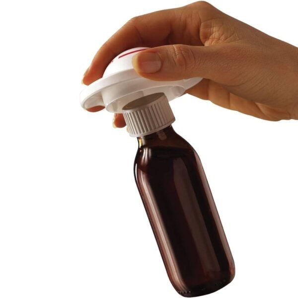 The Multi Grip Bottle Opener opens safety caps on pill bottles, cleaning liquids, and plastic screw lids on soft-drink bottles. To use, simply place the opener over the safety cap, and apply pressure and turning motion to unscrew the cap. The patented design fits securely in the hand and provides increased leverage to make pushing and turning easier. Made of strong, polystyrene plastic, the opener is dishwasher safe. The Multi Grip Bottle Opener is helpful for users who lack strength in their hands.