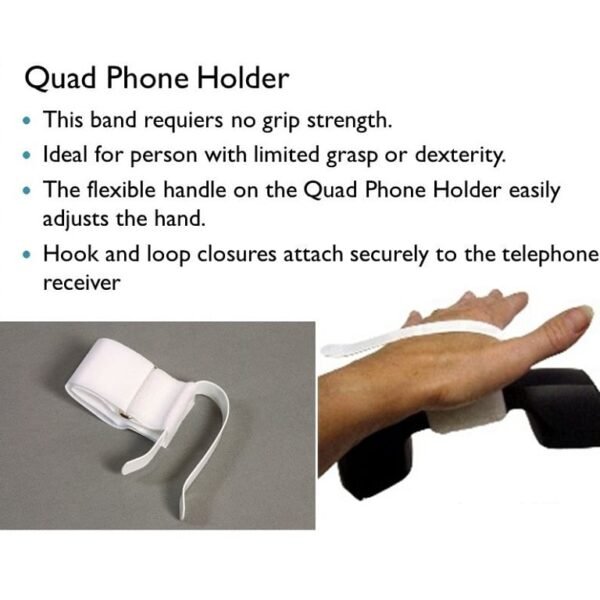 The Quad Hand Clip Universal Holder consists of an epoxy coated metal hand clip with a Velcro strap. The hand clip can be bent for a comfortable fit for different hand sizes. The Velcro strap is extra long for attaching to a telephone receiver, hair brush handle, bottle, cup or for other adaptations. The Quad Hand Clip Universal Holder is helpful for users with limited grasp and dexterity to easily pick up a variety of items.