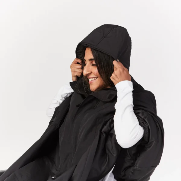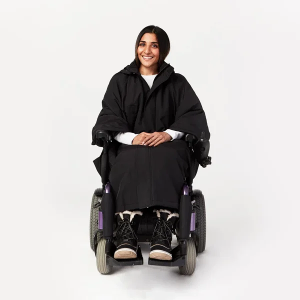 Banish the winter blues with our Parka Cape, the ultimate in uber-warm outerwear for wheelchair users. We made the front of this parka extra long in the front to cover your legs and feet while making your way around town. A relaxed fit and a custom cut for the seated frame shows our commitment to our Ease-of-Dress philosophy.
