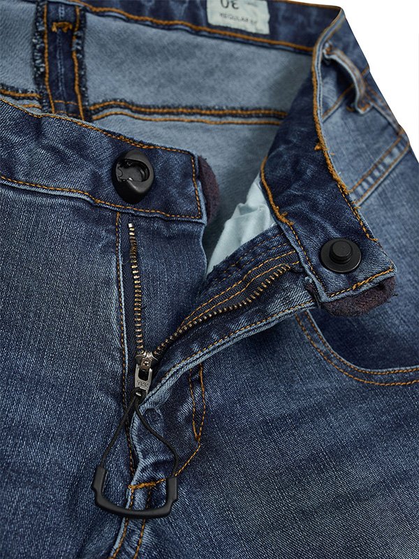 8. Besides the regular ‘button fly’, our jeans are available with a Fidlock magnetic & hook and loop closure. Quite handy. The loop is of a soft feeling velour that opens & closes softly without noise or hassle.