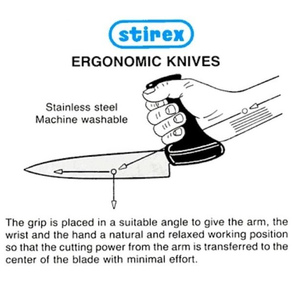 The Stirex Ergonomic Chef’s Knife has a professional grade blade for multipurpose use such as slicing, dicing and chopping. This ergonomically designed, fist grip handle knife provides better hand positioning allowing the arm, wrist and hand a neutral, relaxed working position.