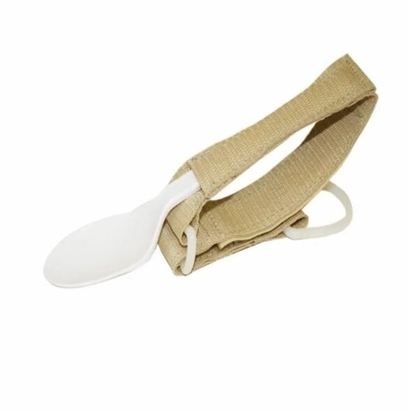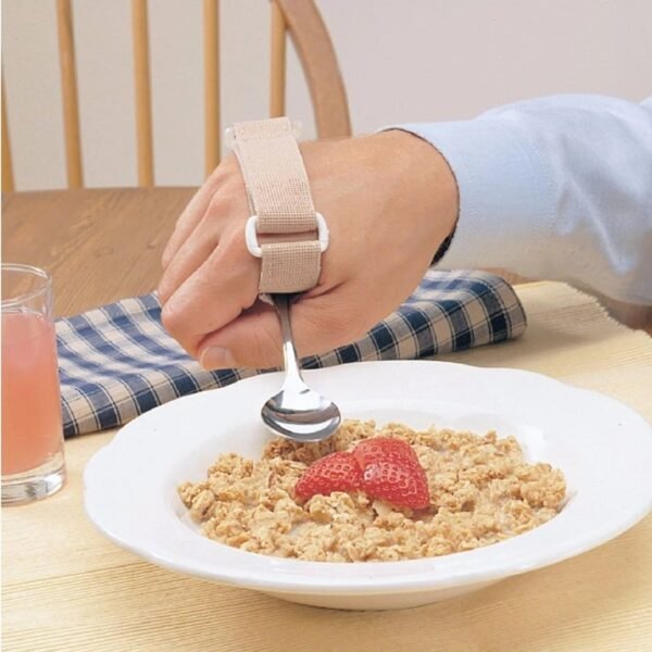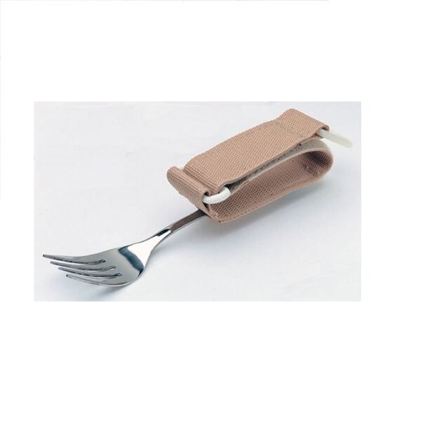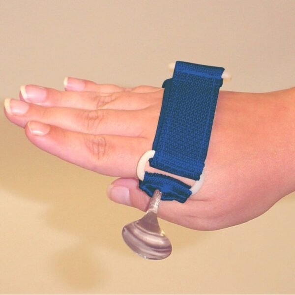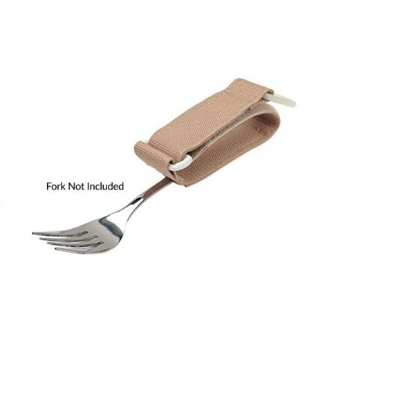 The Utensil Holder Adjustable Universal Cuff can be adjusted to fit the user’s hand by using the Velcro hook-and-loop closure with the D-ring thumb loop. The pocket holds utensils and other small handle items for people who are unable to grip them. The pocket measures 3 inches long, and 1 inch wide and is sewn closed on one end. The strap is made of Polypropylene webbing material and is easy to clean. To determine the correct size, measure the hand across the top of the knuckles. The Small Utensil Holder fits 3.5 to 4.5 inches, Large Utensil Holder fits 4.5 to 4.75 inches. The spoon is shown for demonstration only and is not included with the Utensil Holder Adjustable Universal Cuff.